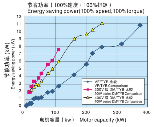 下圖是通過(TYB電機++INV)組合下的綜合效率與(感應電機(IM)+INV)、(直流電機(DM)+直流驅(qū)動裝置)的綜合效率之差來表示節(jié)省功率的。